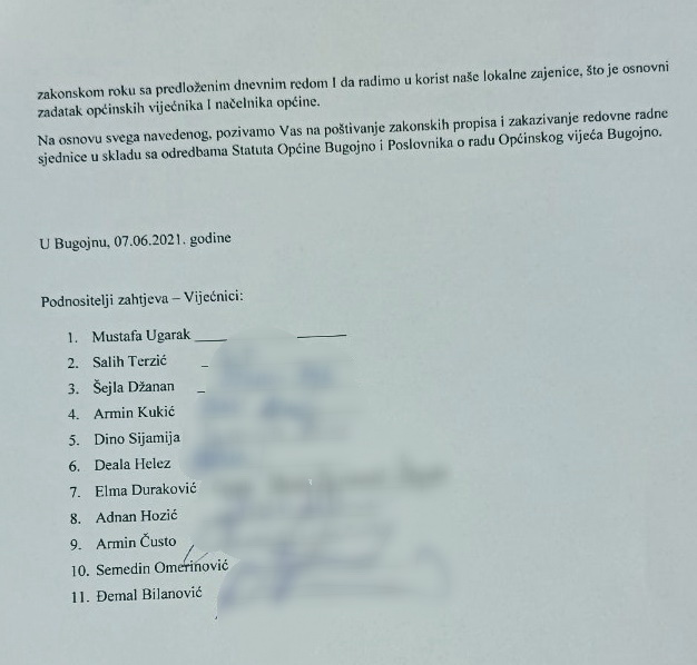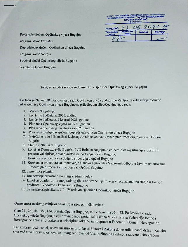 Deset vijećnika je svoj potpis stavilo i kroz predloženi dnevni red zahtjevaju održavanje redovne radne sjednice Opštinskog vijeća Bugojno što je propisano i po poslovniku o radu Opštinskog vijeća te se sjednica mora održati na zahtjev 10 opozicionih vijećnika a to su SDP, NiP i SBB.