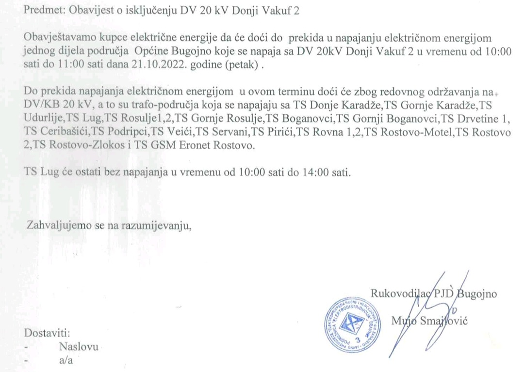 Bugojno Bugojno: Obavijest o isključenju električne energije za PETAK (21.10.2022.) Objavio Redakcija - 20/10/2022 Bugojno: Obavijest o isključenju električne energije za PETAK (21.10.2022.)