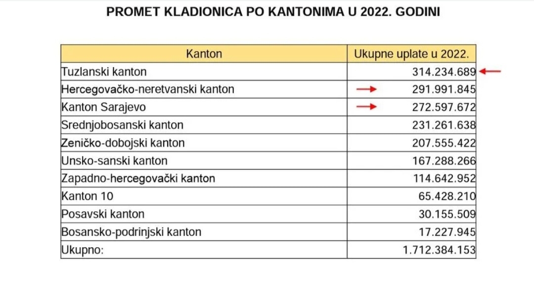 U protekloj godini je Federacija BiH od kladionica preko poreza i naknada zaradila 43.266.443 KM, a građani su uplatama kladioničarima ostavili skoro dvije milijarde...