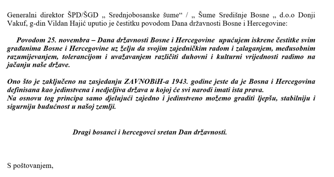Čestitke Čestitka generalnog direktora ŠPD/ŠGD Vildana Hajića povodom Dana državnosti BiH Objavio Redakcija - 24/11/2019