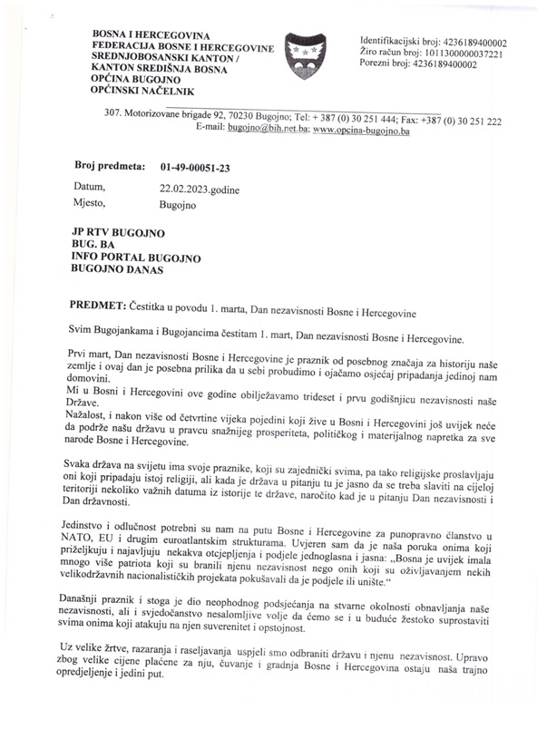 Čestitke Čestitka načelnika Hasana Ajkunića povodom Dana nezavisnosti Bosne i Hercegovine Objavio Redakcija - 28/02/2023 Čestitka načelnika Hasana Ajkunića povodom Dana nezavisnosti Bosne i Hercegovine