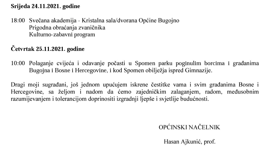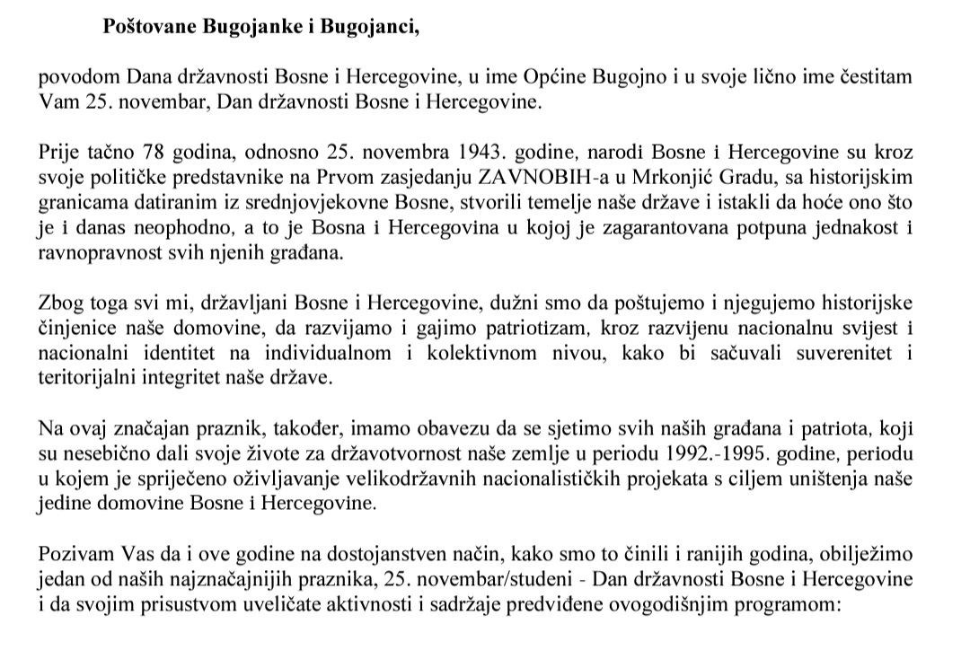 BugojnoČestitke Čestitka načelnika Općine Bugojno za 25. novembar-Dan državnosti BiH Objavio Redakcija - 24/11/2021