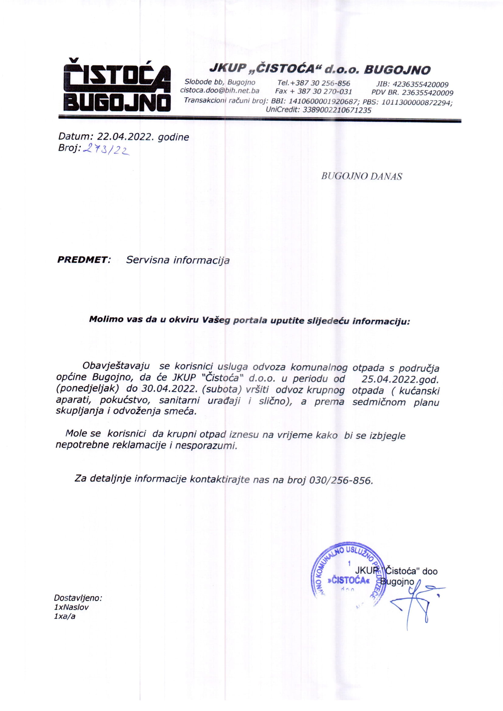 BugojnoVijesti Čistoća Bugojno odvozi krupni otpad od narednog ponedjeljka do subote Objavio Redakcija - 22/04/2022 Obavijest za korisnike
