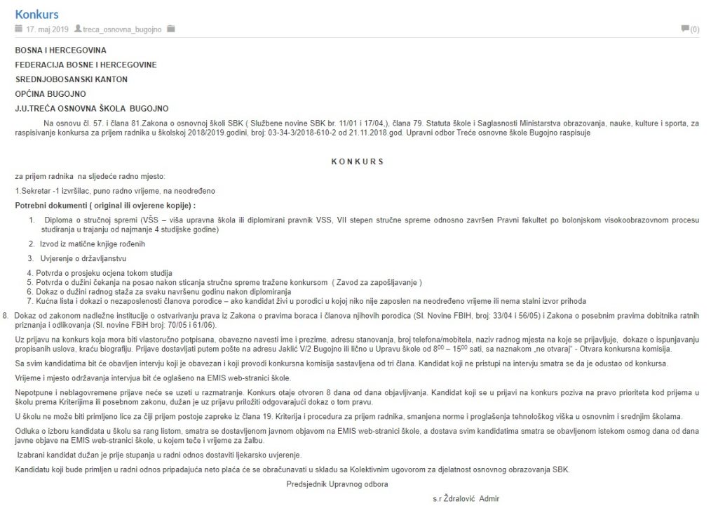 O kojem konkursu se radi pogledajte u nastavku, prilažemo Vam poništeni konkurs iz februara ove godine koji je tada raspisan u Nezavisnim novinama, a koji smo također objavili da što više potencijalnih kandidata sazna za konkurs, dok se uprava škole ovaj put odlučila da ne objavi konkurs u Nezavisnim novinama već na slabo poznatom portalu za konkurse škola www.e-skole.ba.