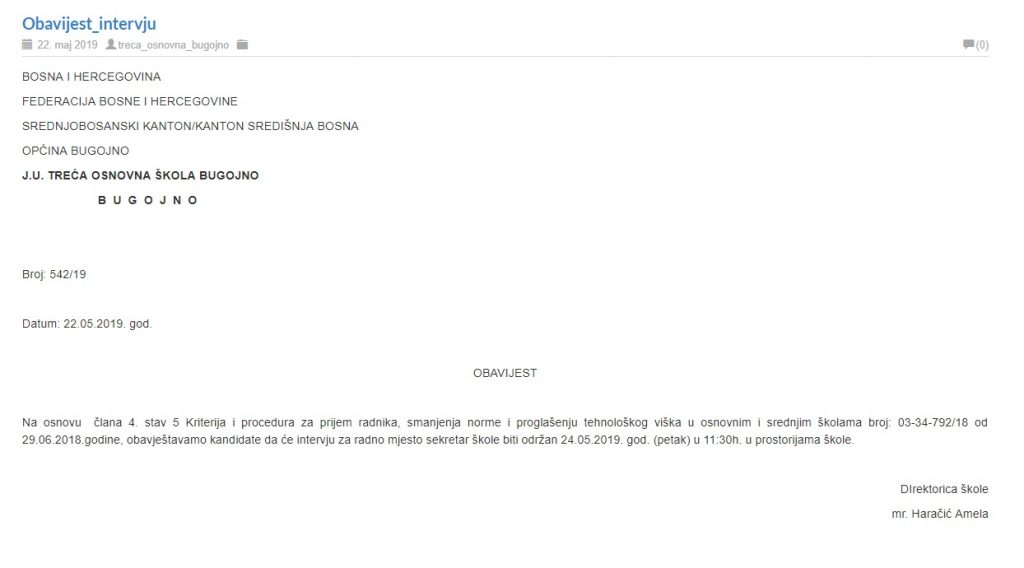 Ništa tu ne bi čudno bilo da nam se u redakciju nije javio potencijalni kandidat diplomirani pravnik (ime poznato redakciji) kazavši “Stavili obavijest da je intervju u petak (24.05.2019). A, još traje rok od 8 dana za prijavu. Oni su obavezni po Kriterijumu da oglas istovremeno objave u novinama, na njihovoj oglasnoj ploci i EMIS stranici škole. Znači, morao je biti objavljen 17.05.“