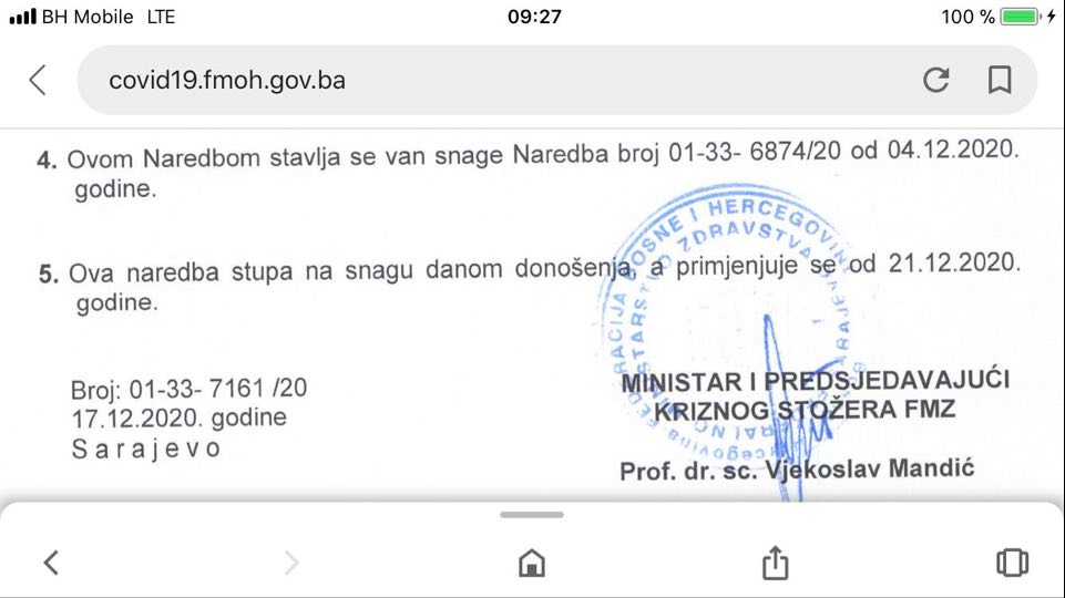 17.12.2020. godine Krizni stožer Federalnog ministarstva zdravstva donio je naredbe koje su se primjenjivale od 21.12.2020. i trajale su 14 dana tj. do danas, piše portal Bugojno Danas.