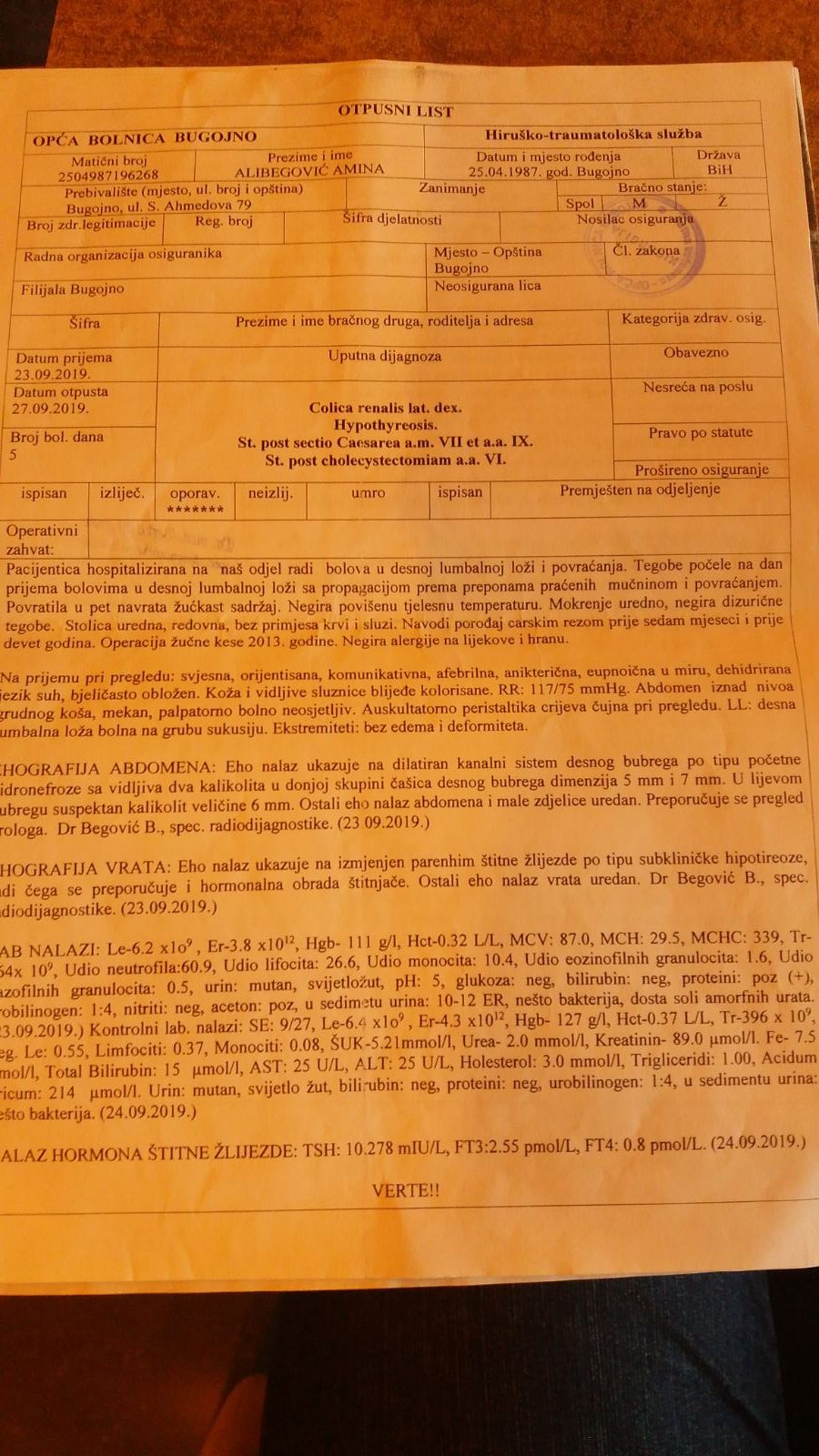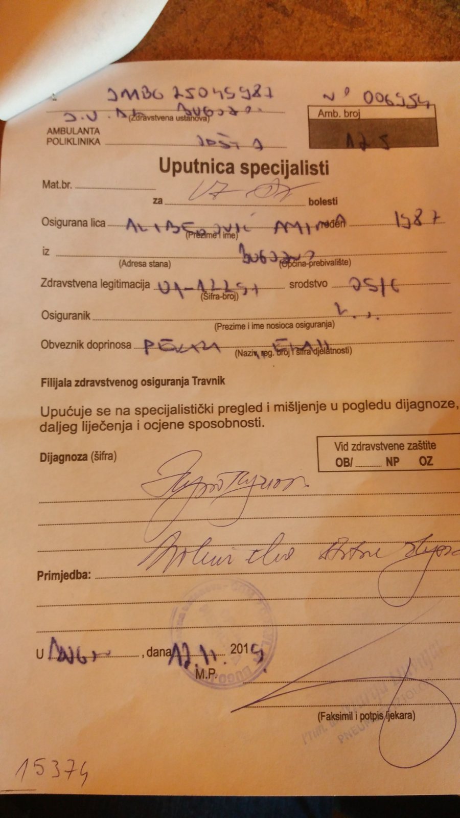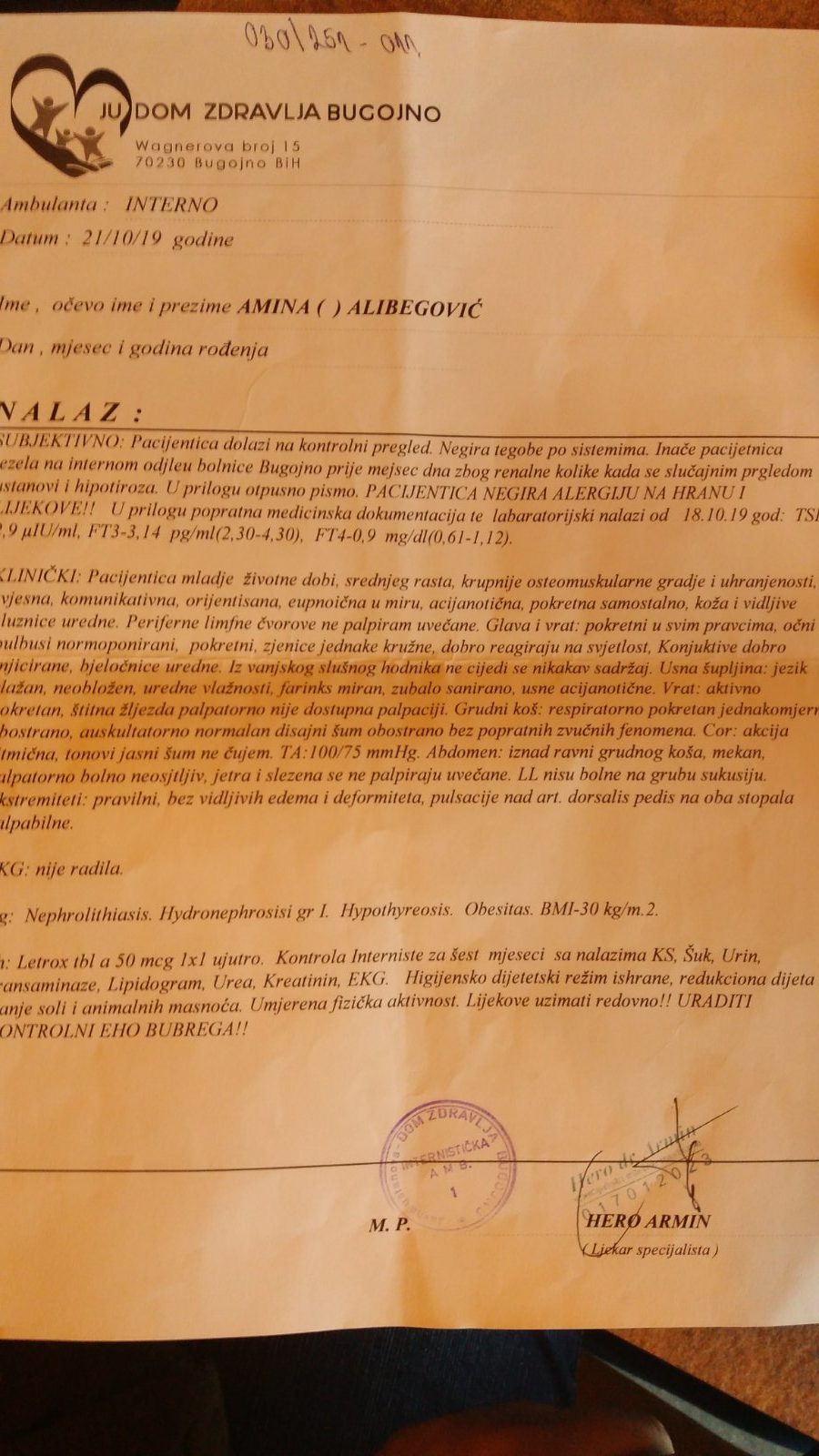 “20.12.2019. predata uputnica za snimanje bubrega i štitne žlijezde, u četvrtak 30.01.2020. obavještena da u subotu 01.01.2020 u 15 i 40 dođe na snimanje i sahat prije popije litar vode. Prilikom ulaska doktoru Jarebu, pogledao uputnice i odmah rekao: Vi gospođo imate veliki problem. Ostala sam zatečene jer sam pomislila da se radi o nekoj bolesti i pitala u čemu je problem. Rekao je da ne prima bolničke pacijente i ko je vama dao ove uputnice da vi ovdje dođete. Na to sam odgovorila dr.Marija Duvnjak moj porodični doktor a on tvrdi da je Dr. Marija Duvnjak odavno u penziji i da sam na prevaru došla i da se obratim Fudi. Pitala sam kako ga doktorska etika dopušta da pacijenta koji je došao na pregled i ima sve uredno papire po pozivu sam došla itd. da bi on odgovorio da njima doktorska etika sve dopušta. Pozvala sam policiju koja je napravila zapisnik.”
