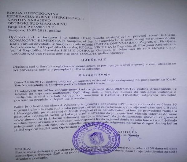 Općinski sud u Sarajevu, sudija Sanela Džidić postupajući u pravnoj stvari tužitelja Elmedina Konakovića,z zastupanog po advokatu Faruku Kariću iz Sarajeva, protiv tuženih Portal Dnevno d.o.o. Zagreb, ul Florijana Adreševca, broj 14. R. Hrvatska i Šimić Josipa iz Kreševa, VSP 1500,00 KM, zastupanih po advokatima Jadranku Lukiću. dr. Rami Atajiću i Belmi Balijagić Džuho, donio je.