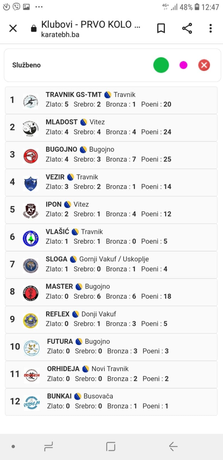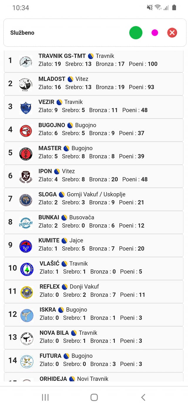Jučer smo učestvovali na kantonalnom takmičenju u Vitezu, na kojem je nastupilo preko 400 takmičara iz 16 klubova. Ostvarili smo sjajan rezultat osvojivši 6 zlatnih, 5 srebrnih i 9 bronzanih medalja i tako u ukupnom plasmanu zauzeli visoko četvrto mjesto. Važno je istaknuti da smo nakon takmičenja u katama završili na trećem mjestu i kao klub sa najviše osvojenih bodova u katama. 🏆Za najboljeg takmičara cijelog turnira u muškoj konkurenciji proglašen je član Karate kluba Bugojno, Salih Alić.🏆Naši mladi takmičari su se sjajno predstavili i u katama i u borbama i pokazali izuzetan napredak.