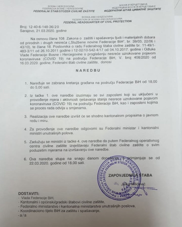 Prema naredbi koja je donesena naređuje se zabrana kretanja građana na području Federacije BiH od 18 sati navečer do 5 sati ujutru. Ova naredba stupa na snagu od sutra navečer.
