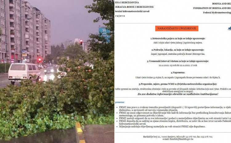 Građani su upozoreni na moguće smetnje, strukturalna oštećenja i rizik od povrede od iščupanih stabala i krhotina koje nosi vjetar. Također je moguć i nestanak struje.
