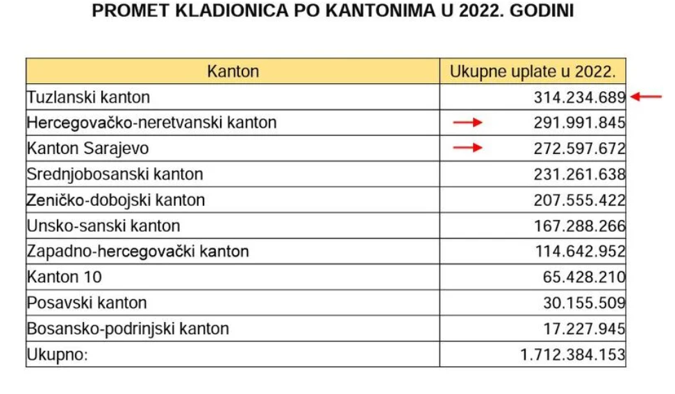 Najviše uplata u 2022. je bilo u Tuzlanskom kantonu, tačno 314.234.689 KM, a najmanje u Bosanskopodrinjskom kantonu, svega 17.227.945. Sarajlije su u kladionicama prošle godine ostavili 272.597.672 KM.