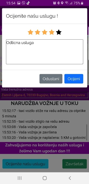 Pozivanje taxi vozila nikad nije bilo jednostavnije. Dovoljno je pokrenuti aplikaciju na vašem telefonu, i pritisnuti jedno dugme. Ne morate stajati na trotoaru po kiši, ne morate mahati i gledati koji je taxi slobodan i koji ne. Po aktivaciji, sistem će vam dodijeliti najbliži taxi, prikazati će vam detalje o vozilu, i prosječno vrijeme dolaska do vaše lokacije. Sve ovo se odvija 4 puta brže od uobičajenih načina poziva taxi vozila