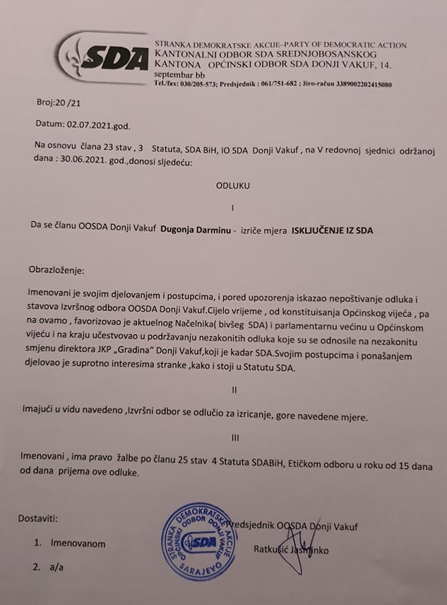 Dr. Mensura Bešir i Darmin Dugonja, vijećnici SDA Donji Vakuf izbačeni iz stranke jer su imali svoj stav, uputili su saopćenje za javnost: