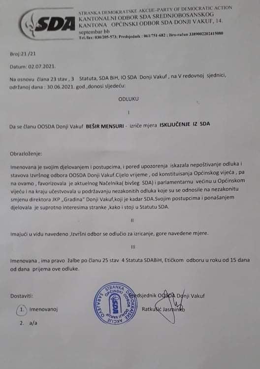 „Poštovani sugrađani i sugrađanke, svi oni koji su svoje povjerenje na izborima dali nama, na sjednici Izvršnog odbora SDA Donji Vakuf, odlukom poslušnih (jer su neposlušne isključili) donijeli su odluku o našem isključenju – pozivajući se na kršenje statuta SDA. Prije svega želimo da iskažemo činjenicu da smo poštovali stavove i mišljenja kluba vijećnika SDA Donji Vakuf i da smo svoje stavove iznosili transparentno i isti su poštovani i izglasani na sjednicama Kluba. Isključeni smo jer smo opći interes i interes građana Donjeg Vakufa stavili ispred vlastitog interesa. Naše isključenje je dobra prilika da javno iskažemo nezadovoljstvo i neslaganje sa aktuelnom politikom Općinske organizacije SDA Donji Vakuf. Prevaziđena i retrogradna politika bazirana isključivo na ostvarivanju ličnih interesa ne treba ni imati podršku mladih ljudi. Također, nerazumijevanje i neuvažavanje ženske populacije, nemajući sluha za potencijal koji mladi i žene imaju, rezultiralo je ovim činom, ne obazirući se na to da je pomenuta Vijećnica Bešir, u nekoliko posljednjih ciklusa lokalnih izbora, ubjedljivo ostvarila najbolji rezultat za Općinsko vijeće, što govori da sadašnje rukovodstvo SDA Donji Vakuf ne uvažava ni mišljenja svojih birača, što je sasvim suprotno od onoga za šta su se zalagali u predizbornoj kampanji. Više ne pripadamo nedemokratskom stranačkom ambijentu gdje je iznošenje drugačijeg stava i mišljenja nepoželjno. U narednom periodu djelovat ćemo kao nezavisni vijećnici, za opći interes, jaku lokalnu zajednicu, sve njene ustanove, institucije i biti na usluzi našim sugrađanima kao što smo bili i do sada„