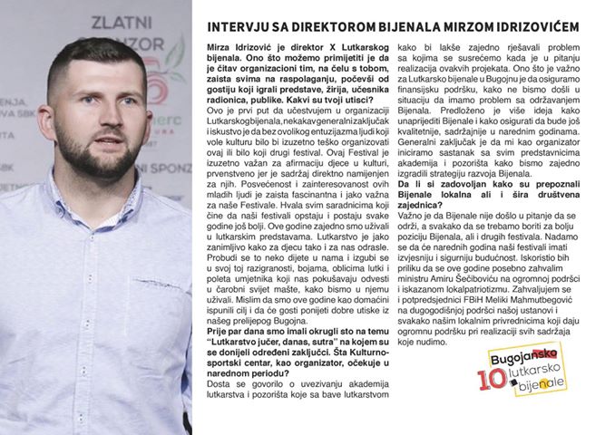 Kultura Intervju sa direktorom Lutkarskog bijenala Mirzom Idrizovićem Objavio Redakcija - 15/09/2019 Intervju sa direktorom Lutkarskog bijenala Mirzom Idrizovićem