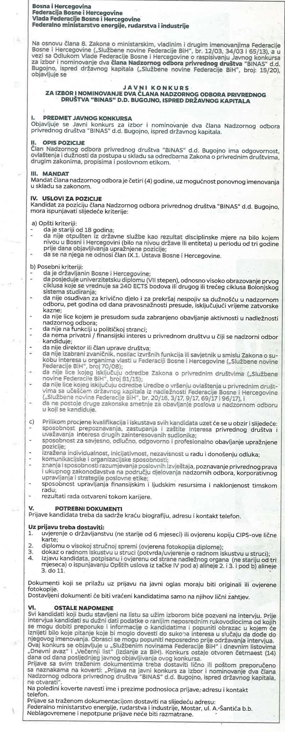 Javni konkurs za dva člana nadzornog odbora Binas Bugojno