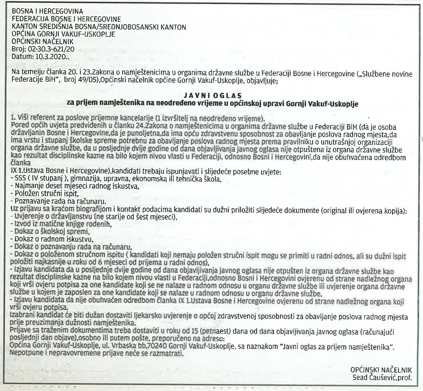 OglasiPosao Javni konkurs za prijem višeg referenta u Općinu Gornji Vakuf-Uskoplje Objavio Redakcija - 13/03/2020 Foto: Kerim Šečunović