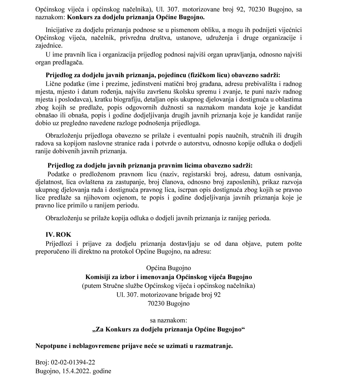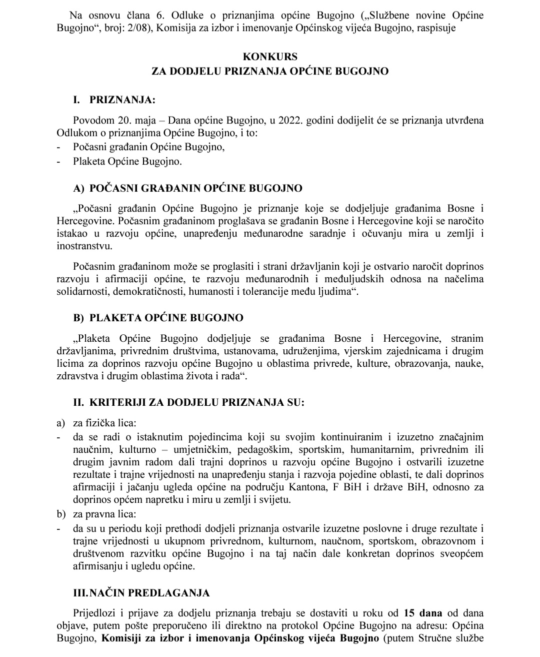 Bugojno Konkurs za dodjelu priznanja Općine Bugojno Objavio Redakcija - 18/04/2022 Komisija za izbor i imenovanja Općinskog vijeća Bugojno raspisala je Konkurs za dodjelu priznanja Općine Bugojno
