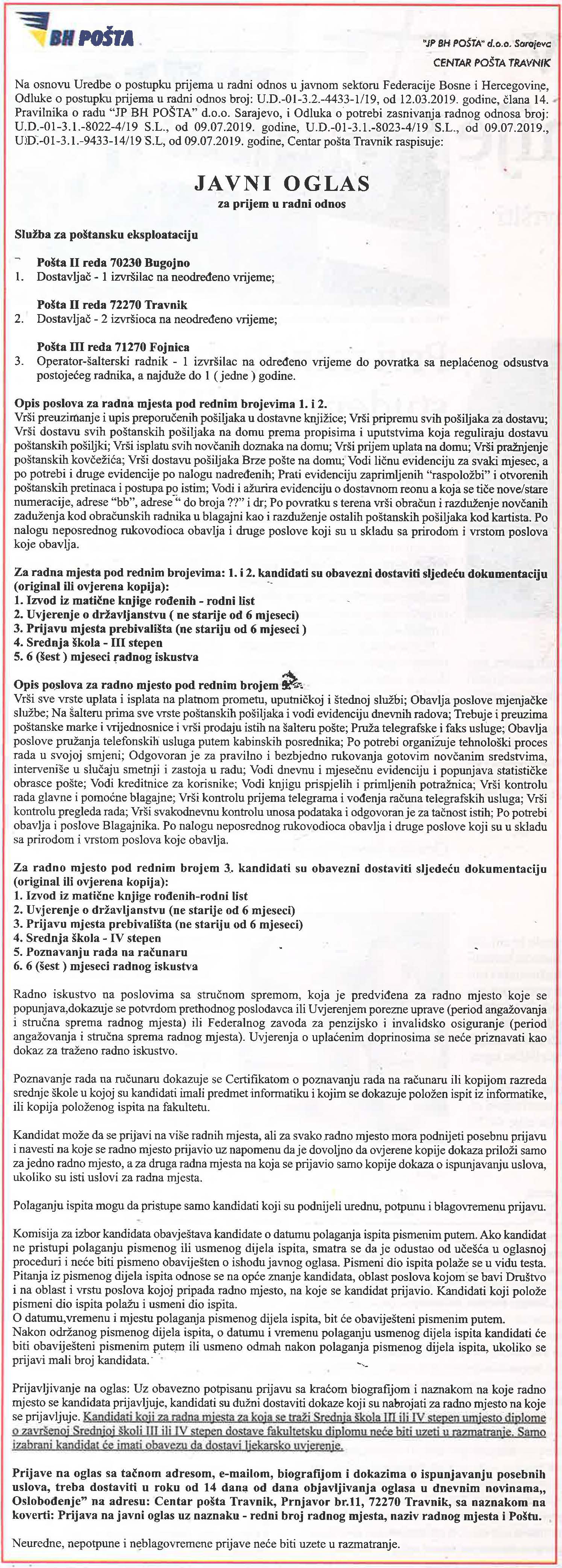 OglasiPosao Konkurs za poštara u Bugojnu Objavio Redakcija - 06/08/2019 Konkurs ostaje otvoren 14 dana.