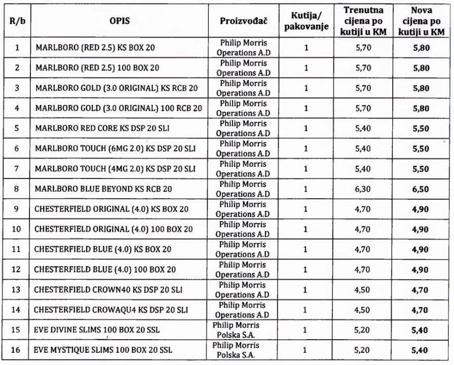 Na trafikama su od danas, 1. jula, već poskupjele cigarete duhanskih proizvoda kompanije Philip Morris. Tako će konzumenti tog branda plaćati 10-20 feninga više po kutiji. Cijene cigareta ove marke sada su od 4,70 KM do 6,50 KM po kutiji.