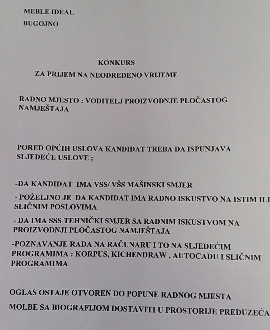 OglasiPosao Meble-Ideal Bugojno: Oglas za prijem jednog radnika, voditelj proizvodnje pločastog namještaja Objavio Redakcija - 21/06/2021 Meble Ideal Bugojno raspisao konkurs za prijem na neodređeno radno vrijeme. Detaljnije u nastavku: