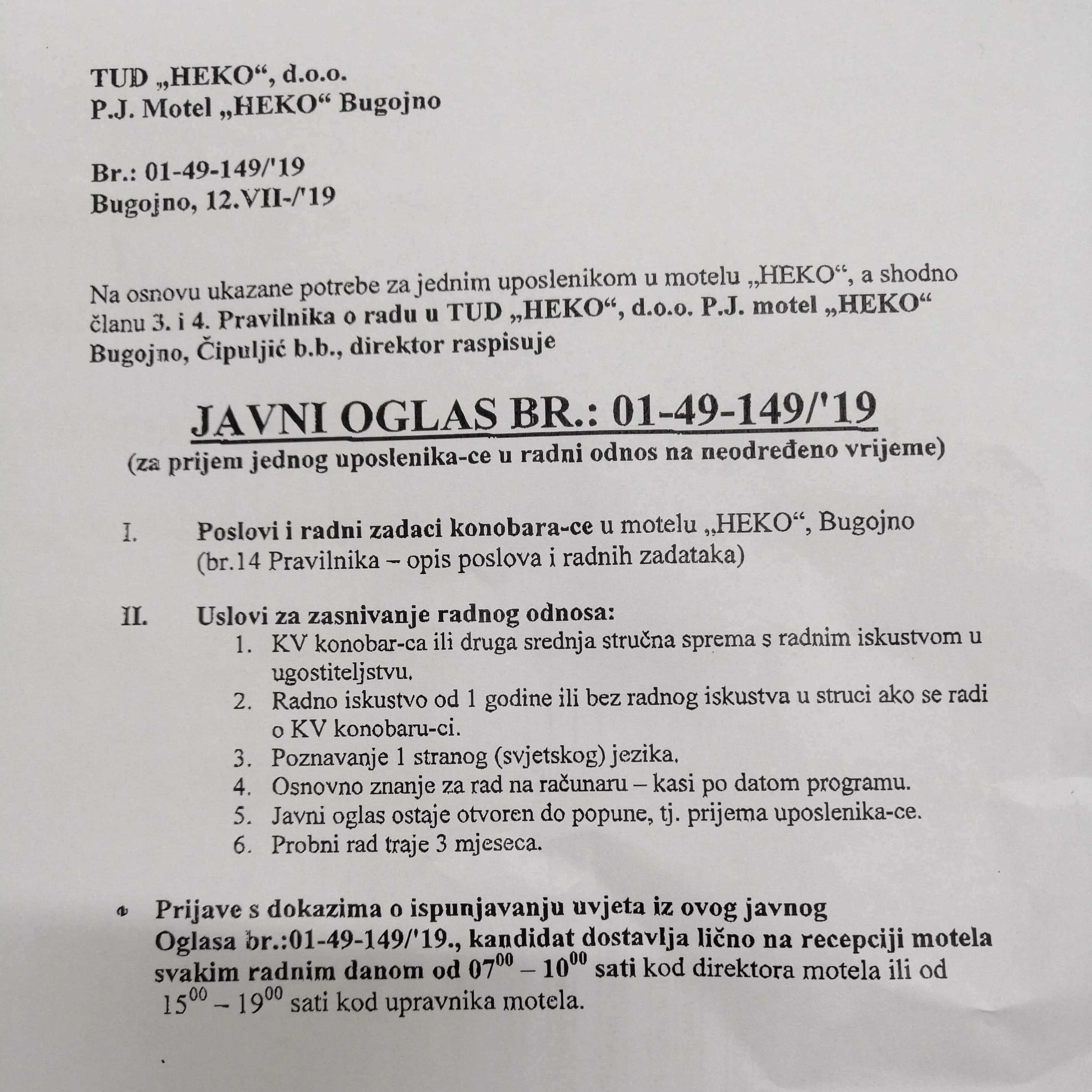 OglasiPosao Motelu Heko Bugojno potreban konobar/ica Objavio Redakcija - 17/07/2019 Oglas pročitajte u nastavku