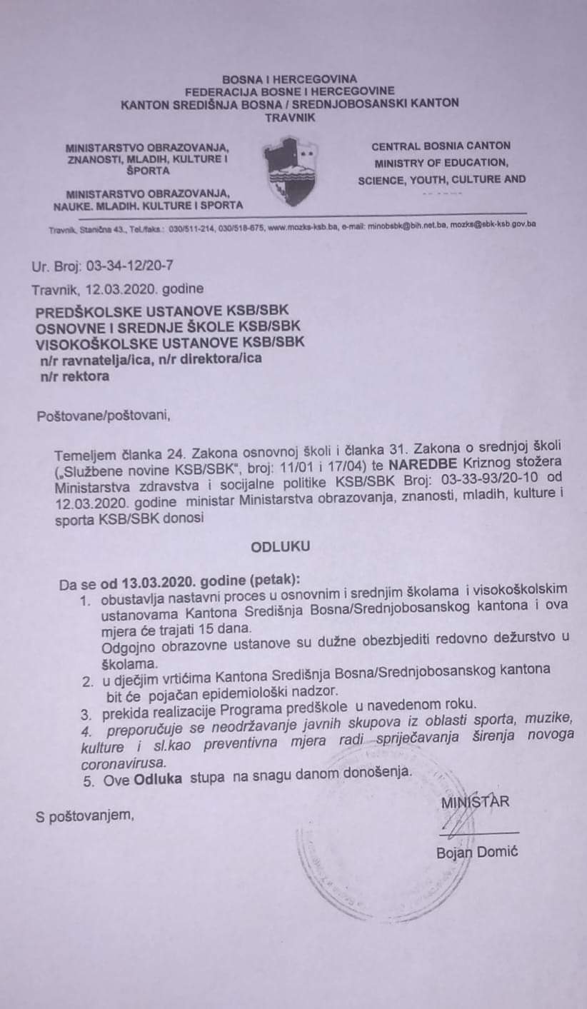 Kako stoji u odluci nastava će biti obustavljena u osnovnim, srednjim i viskoškolskim ustanovama SBK -a.
