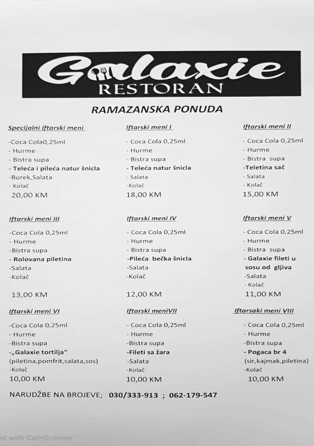 Narudžbe Ramazanskih iftara u restoranu Galaxie Bugojno svakim danom od 09-19h na brojeve: 030/333-913 ; 062/179-547.