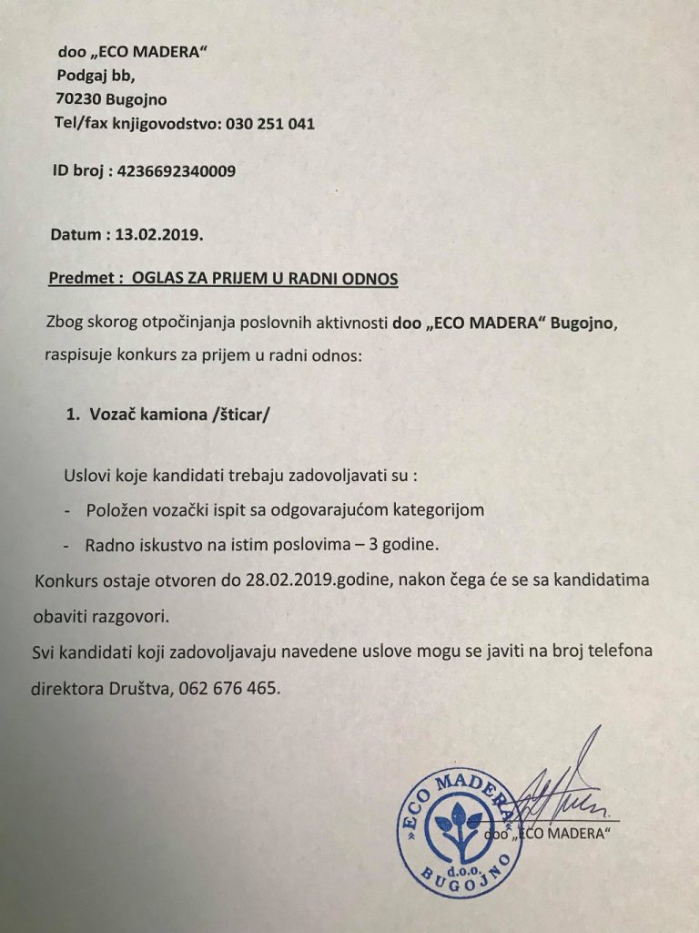 OglasiPosao Novoosnovana firma Eco Madera Bugojno potražuje vozača kamiona Objavio Redakcija - 13/02/2019