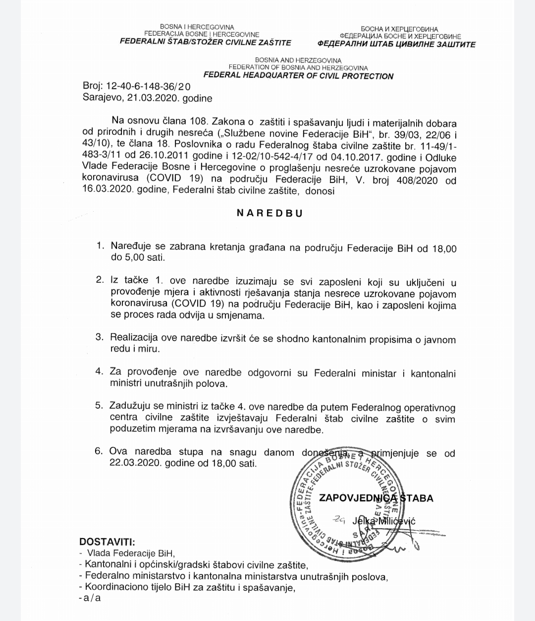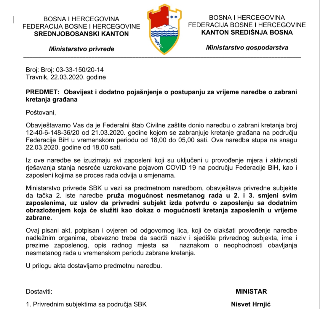 Bugojno Obavijest i dodatno pojašnjenje o postupanju za vrijeme naredbe o zabrani kretanja građana Objavio Redakcija - 22/03/2020