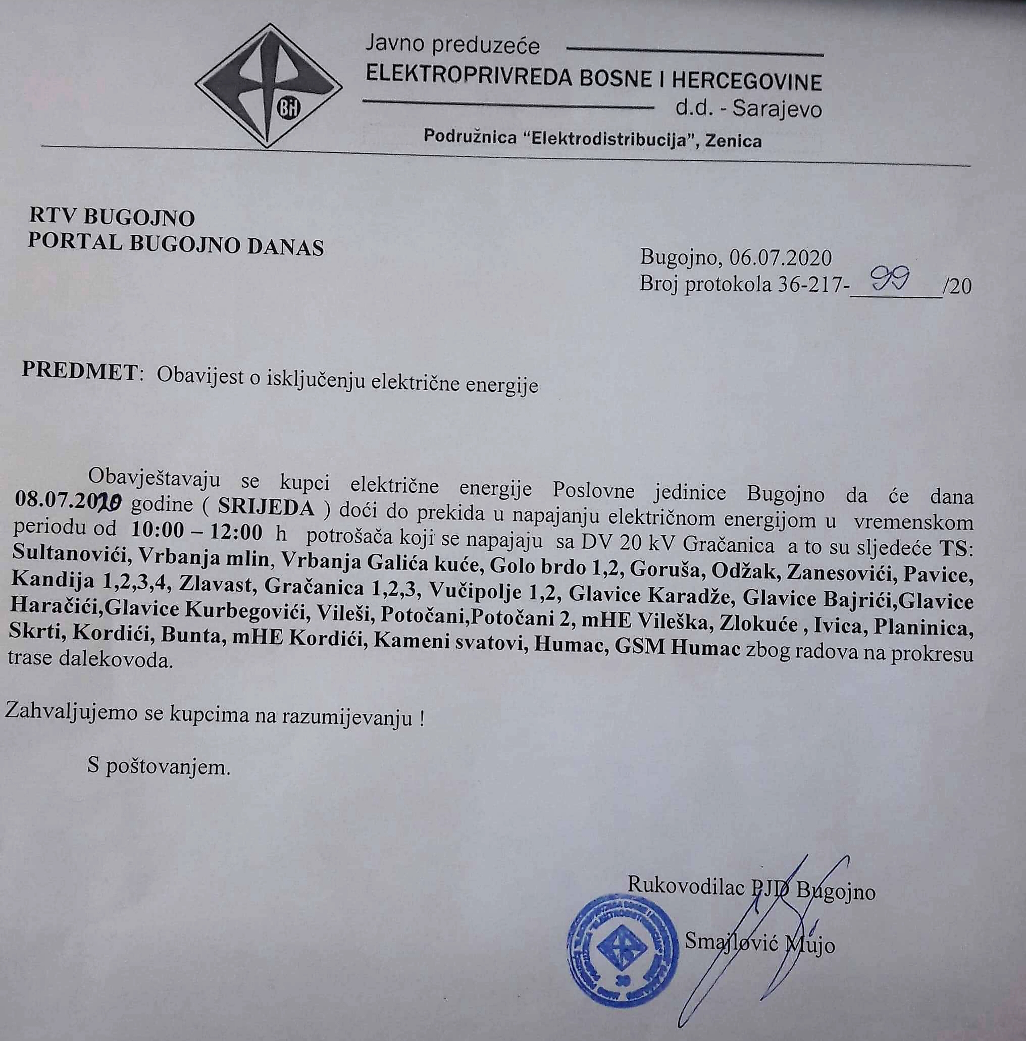 Početna Bugojno Obavijest o isključenju električne energije za SRIJEDA (08.07.2020.)