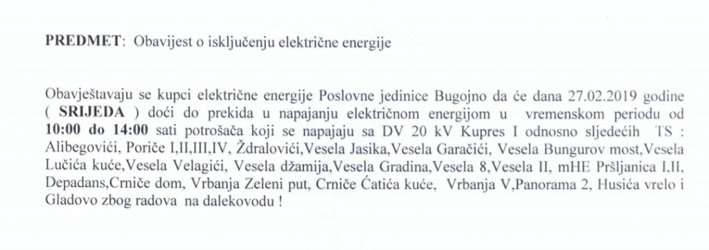 Obavijest o isključenju električne energije za SRIJEDA (27.02.2019.)