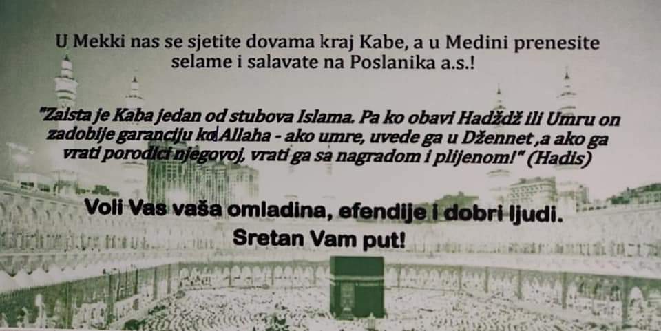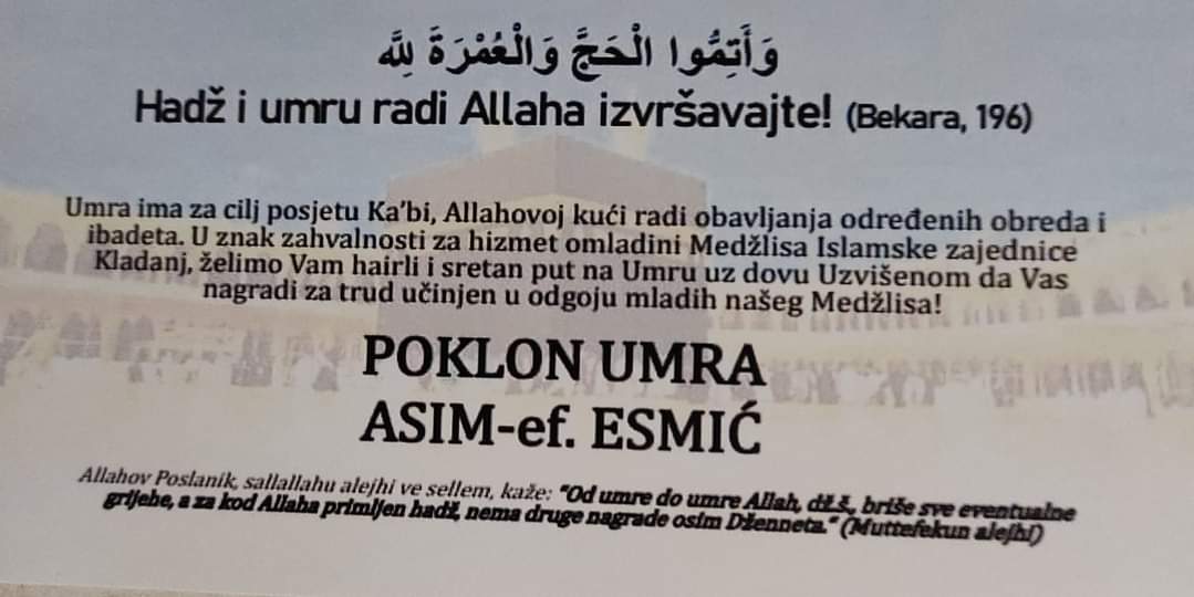 Grupa mladih ljudi u Kladnju odlučila je obradovati glavnog imama Asima efendiju Esmića poklonivši mu odlazak na umru, u znak zahvalnosti za dugogodišnju podršku i druženja.