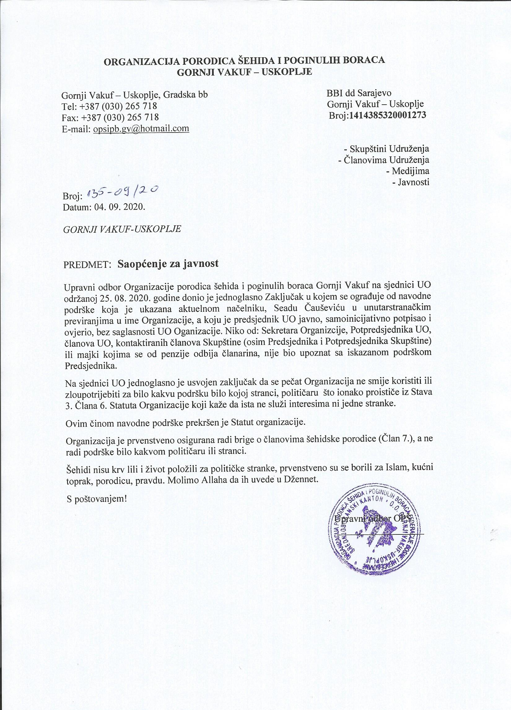 SBK OPŠ: Ograđujemo se od navodne podrške aktuelnom načelniku Seadu Čauševiću Objavio Redakcija - 04/09/2020 Foto: Aldin Ljubunčić