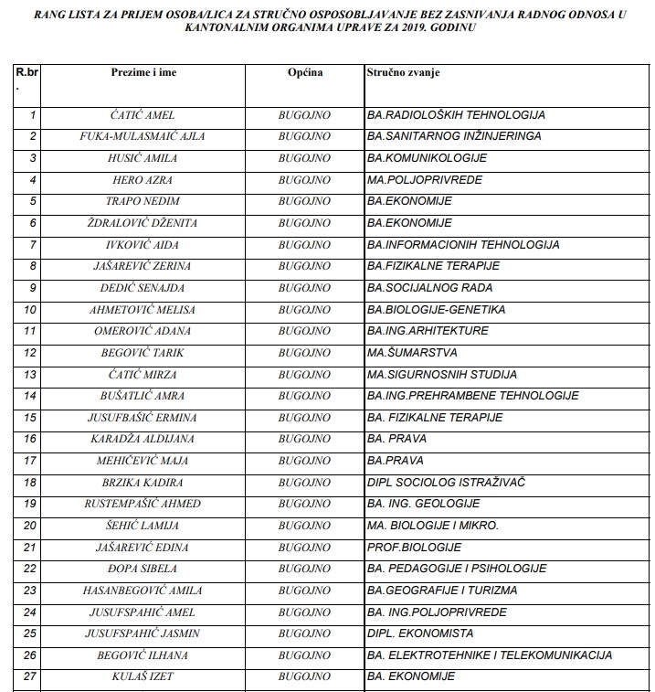 BugojnoVijesti Pogledajte spisak 27 volontera iz Bugojna koji su primljeni u kantonalne organe uprave Objavio Redakcija - 30/01/2019