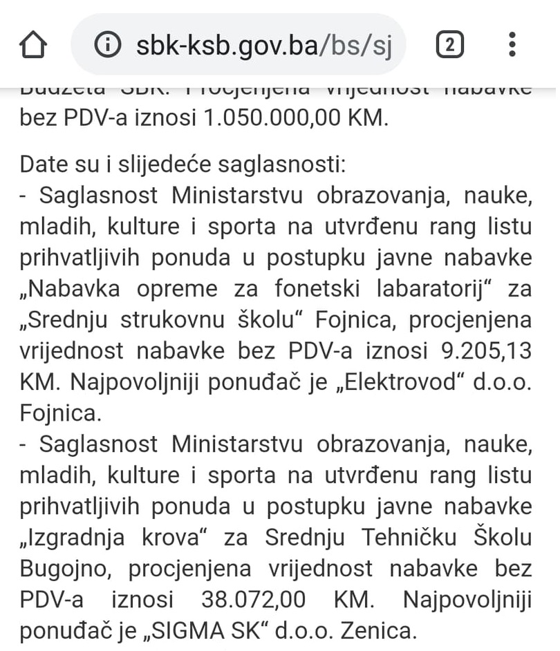 Tek prije 5 dana Vlada SBK je na sjednici dala saglasnost Ministarstvu obrazovanja, nauke, mladih, kulture i sporta na utvrđenu rang listu prihvatljivih ponuda u postupku javne nabavke “Izgradnja krova” za Srednju Tehničku Školu Bugojno, procjenjena vrijednost nabavke bez PDV-a iznosi 38 072 KM a najpovoljniji ponuđač je “SIGMA SK” iz Zenice, a ovaj iznos je trebao biti odobren prije školske godine kako učenici ne bi pohađali nastavu u nehumanim uslovima.