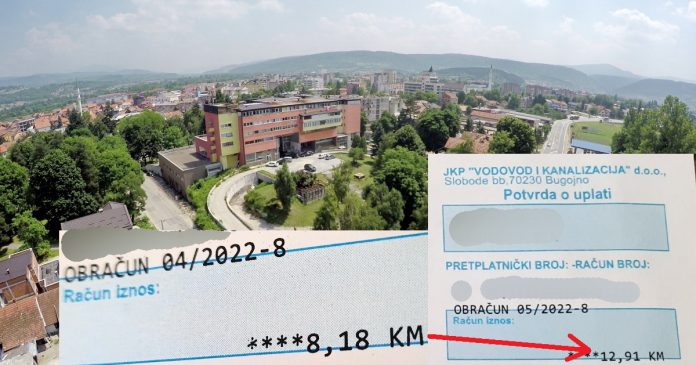 Jutros su Bugojancima stigli uvećani računa za vodu iz JKP “Vodovod i kanalizacija” Bugojno, razlog je poskupljenje po kubnom metru koje je poskupilo za 66% i to sa 0,39 feninga na 0,59 feninga.