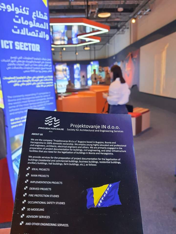 Najpoznatiji svjetski sajam poduzetništva EXPO 2020 otvoren je 1. oktobra u Dubaiju u Ujedinjenim Arapskim Emiratima, a na ovom sajmu, zahvaljujući Vladi ali i Skupštini Kantona Sarajevo, predstavila se i firma za projektovanje iz Bugojna Projektovanje IN d.o.o. Bugojno koja je ispunila konkursnu proceduru koja se odvijala u dvije faze.