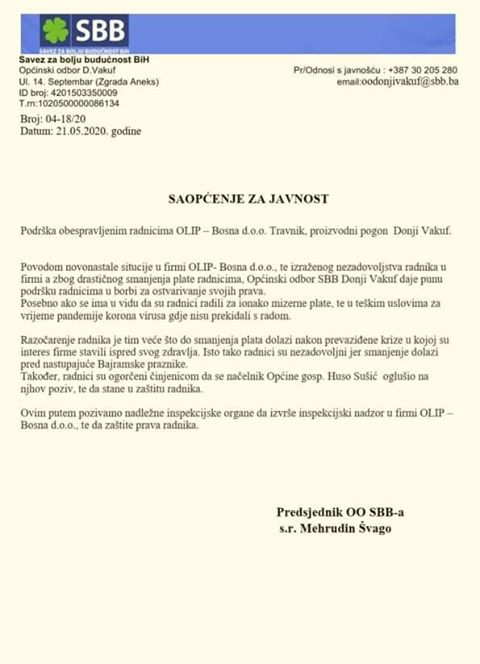 Vijesti SBB Donji Vakuf: Podrška obespravljenim radnicima Olip-Bosna proizvodni pogon Donji Vakuf Objavio Redakcija - 21/05/2020 Saopštenje prenosimo u cijelosti: