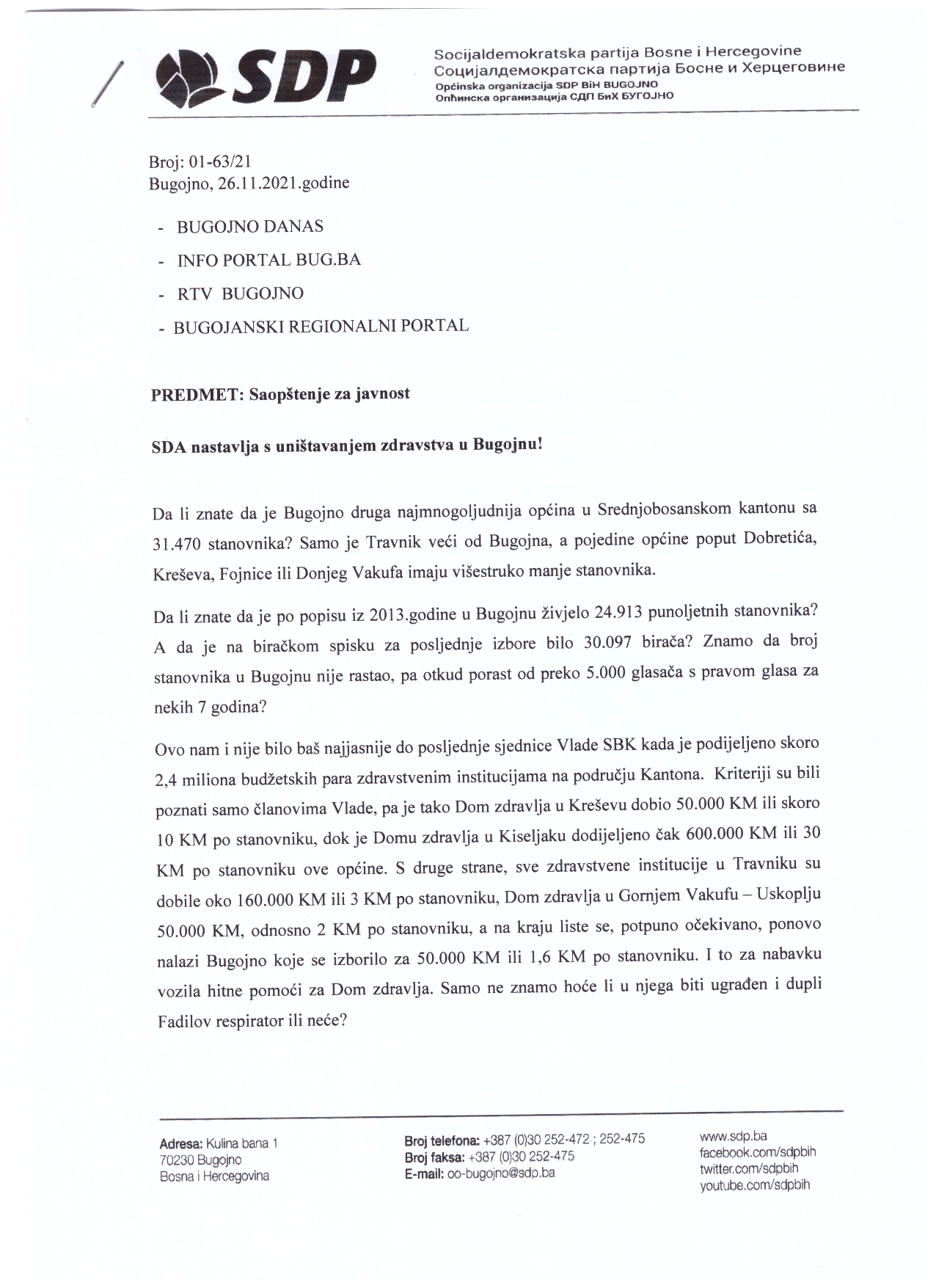 Da li je ovo pravi pokazatelj zdravstvenih potreba Kantona ili još jedna raspodjela plijena između SDA i HDZ-a u kojoj je, ponovo, HDZ prošao neuporedivo bolje? Dokaz da HDZ zaista upravlja Vladom SBK i da je SDA pokazala da je zbog privatnih interesa pojedinaca i mjesta premijera, spremna u svako doba izdati interese građana ovog Kantona i svojih birača? Ili je došla direktiva direktno od Sebije da se ne smije ulagati u zdravstvo gdje je SDA pobijedila kako im se ne bi napakovala nove afera poput respiratora, ili otkrilo ko zna koliko afera koje su se godinama gomilale u zdravstvu na našim prostorima? Bilo kako bilo – čestitamo HDZ-u na uspješnom rukovođenju Vladom i brigom za svoje birače!