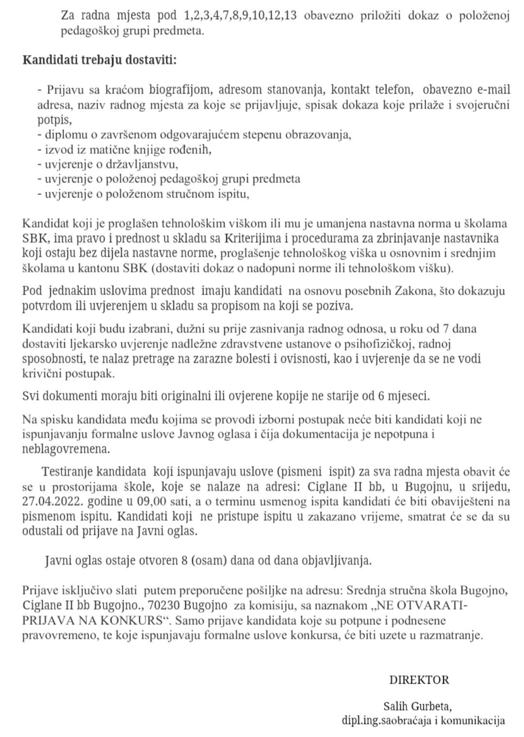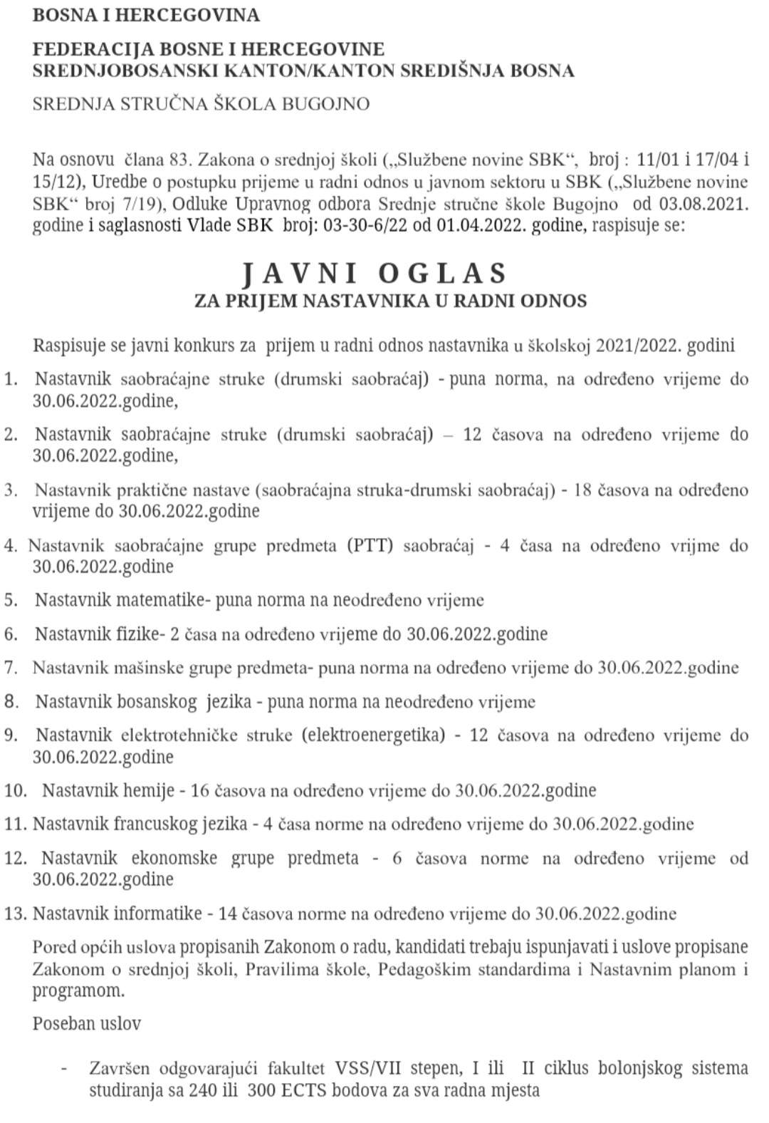 Bugojno SSŠ Bugojno: Javni oglas za prijem 13 nastavnika Objavio Redakcija - 15/04/2022 JAVNI OGLAS ZA PRIJEM NASTAVNIKA U RADNI ODNOS