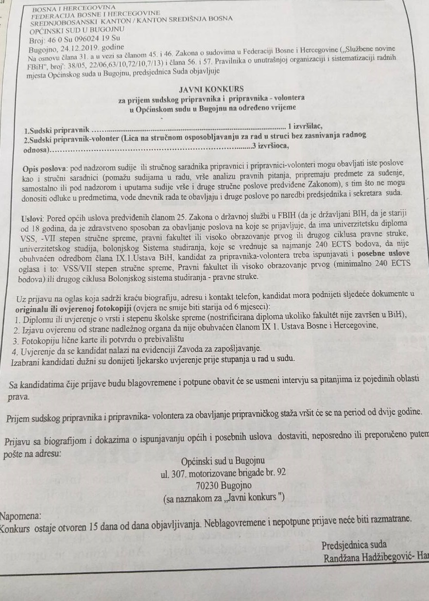OglasiPosao Sud Bugojno raspisao konkurs za 4 pripravnika Objavio Redakcija - 30/12/2019 Sud Bugojno raspisao konkurs za 4 pripravnika