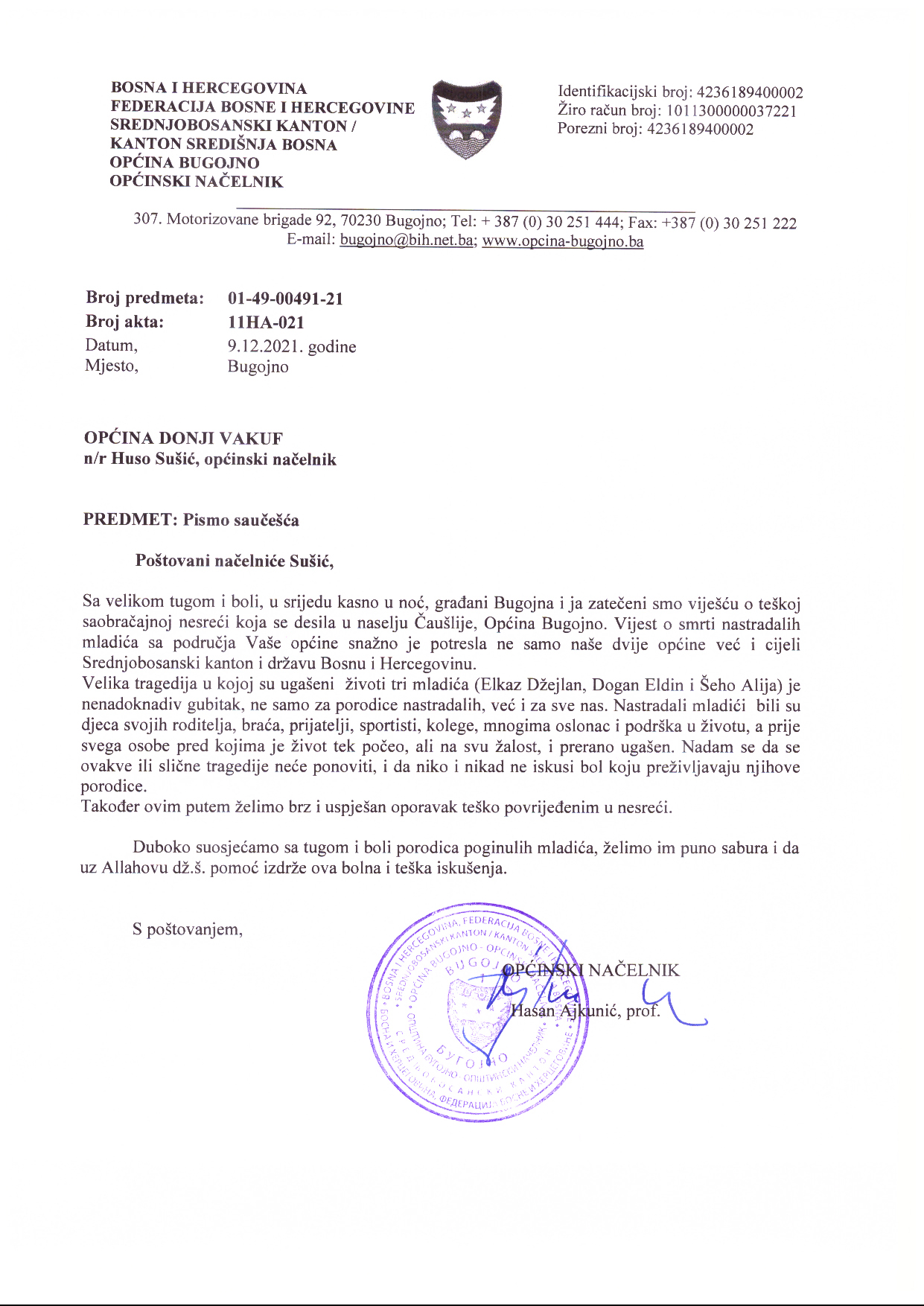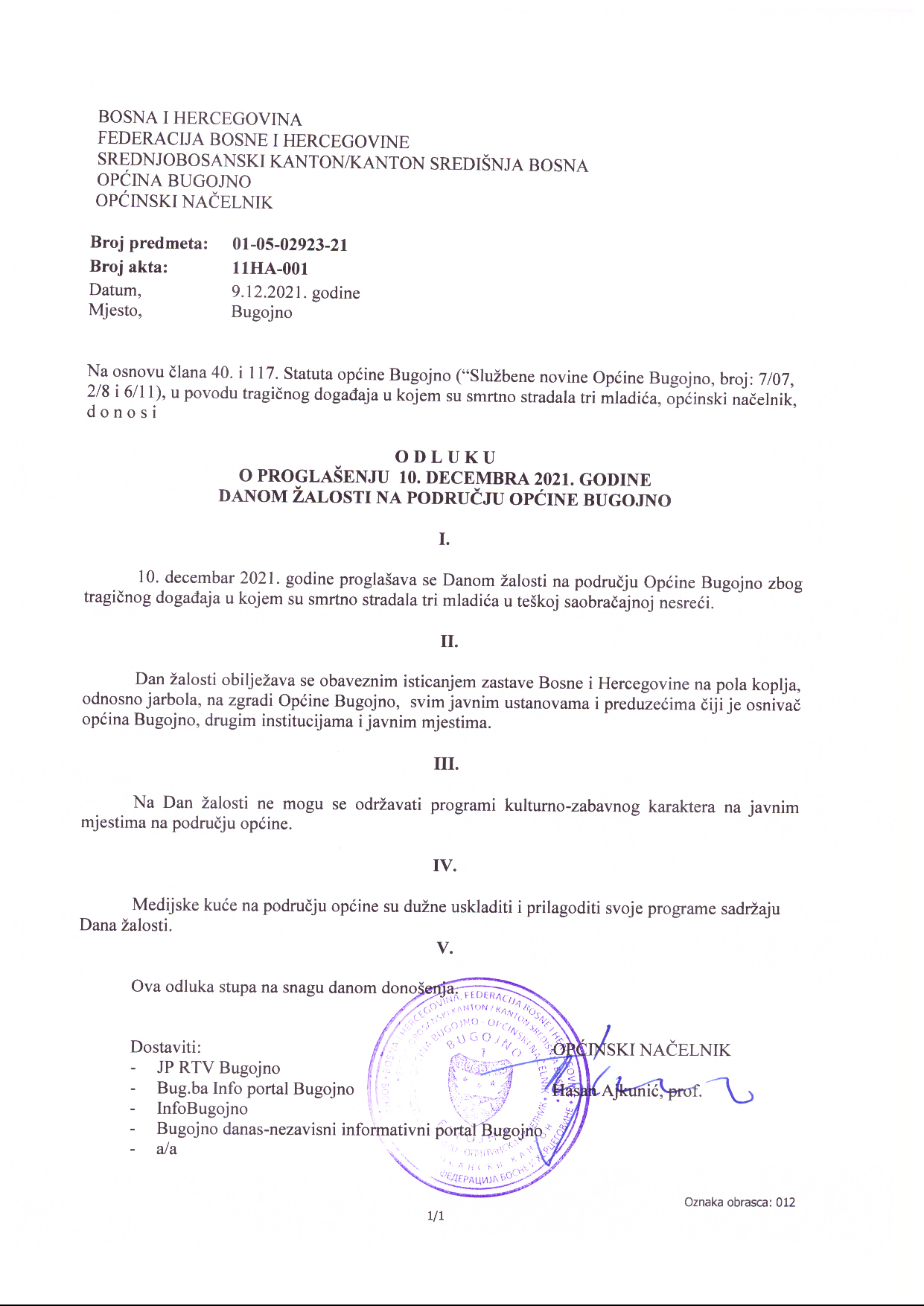 BugojnoVijesti Sutra dan žalosti u Bugojnu zbog tragičnog stradanja trojice mladića Objavio Redakcija - 09/12/2021 Sutra 10.12.2021. dan žalosti u Bugojnu. U prilogu tekst