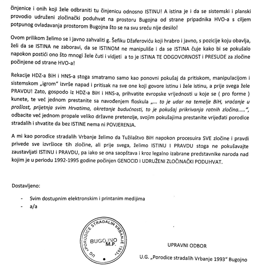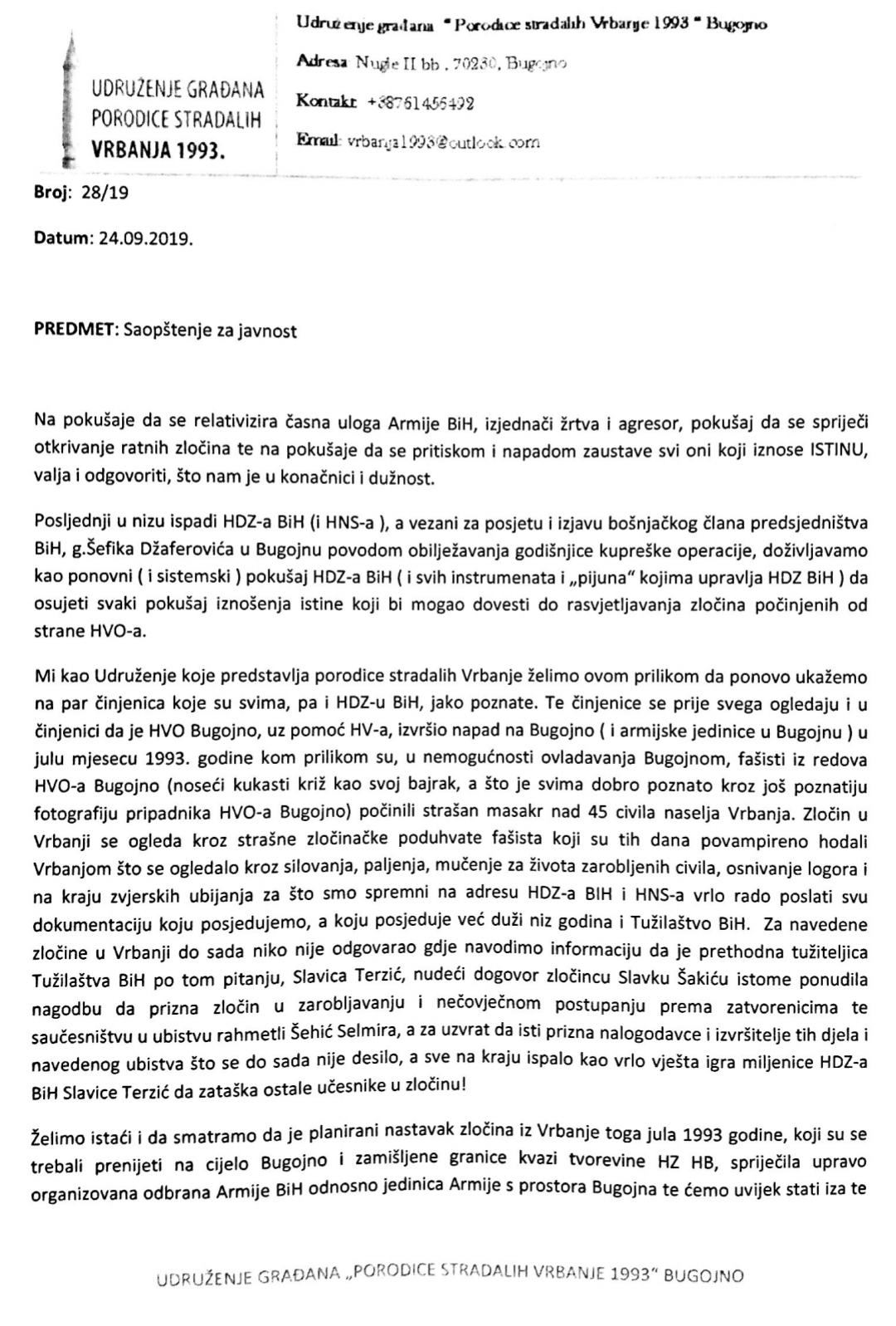 Bugojno U.G. „Porodice stradalih Vrbanje 1993“ Bugojno: Saopštenje za javnost Objavio Redakcija - 24/09/2019