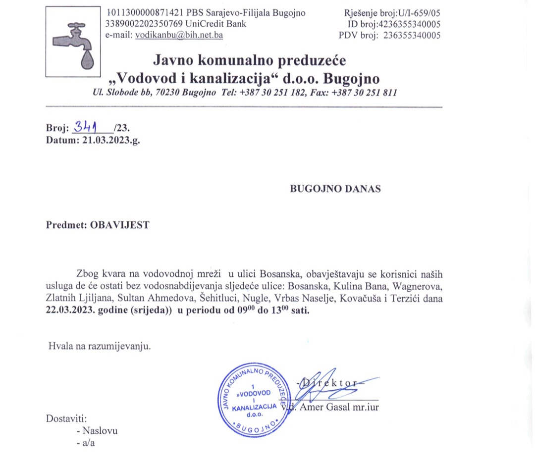 Bugojno U srijedu veći dio Bugojna bez vode od 09:00-13:00 Objavio Redakcija - 21/03/2023 U srijedu veći dio Bugojna bez vode od 09:00-13:00