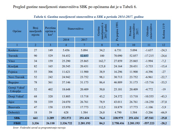 Ono što je također alarmantno jeste to da je u Bugojnu najgore stanje kada je u pitanju smanjenje broja stanovnika u navedenom periodu. U Travniku je 2014. godine živjelo 54.452 stanovnika dok je 2017. godine taj broj smanjen na 52.857 te je Travnik druga općina u Srednjobosanskom kantonu nakon Bugojna po smanjenju broja stanovnika, što za Bugojno predstavlja veliki problem jer Travnik ima 20 000 više stanovnika od naše Općine.